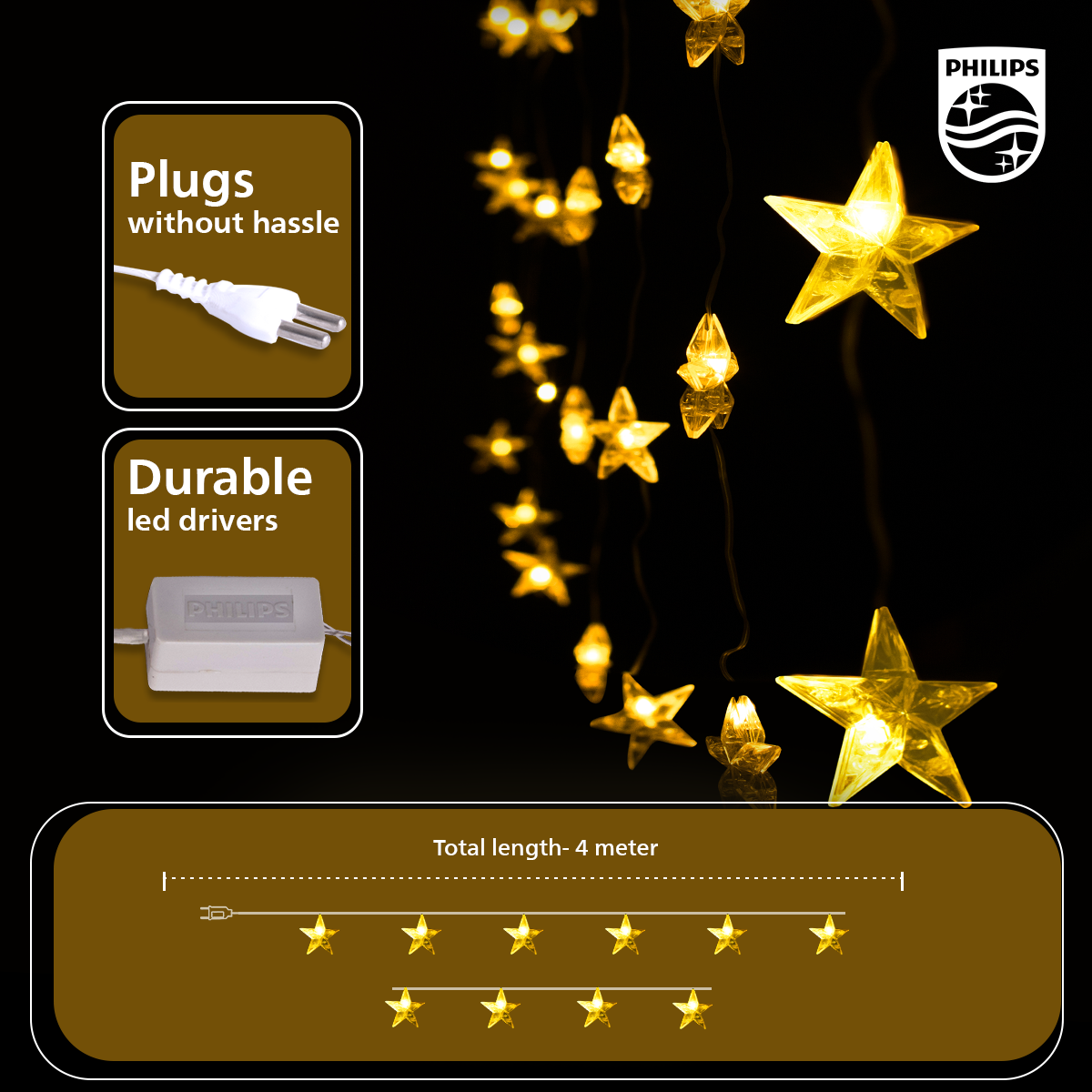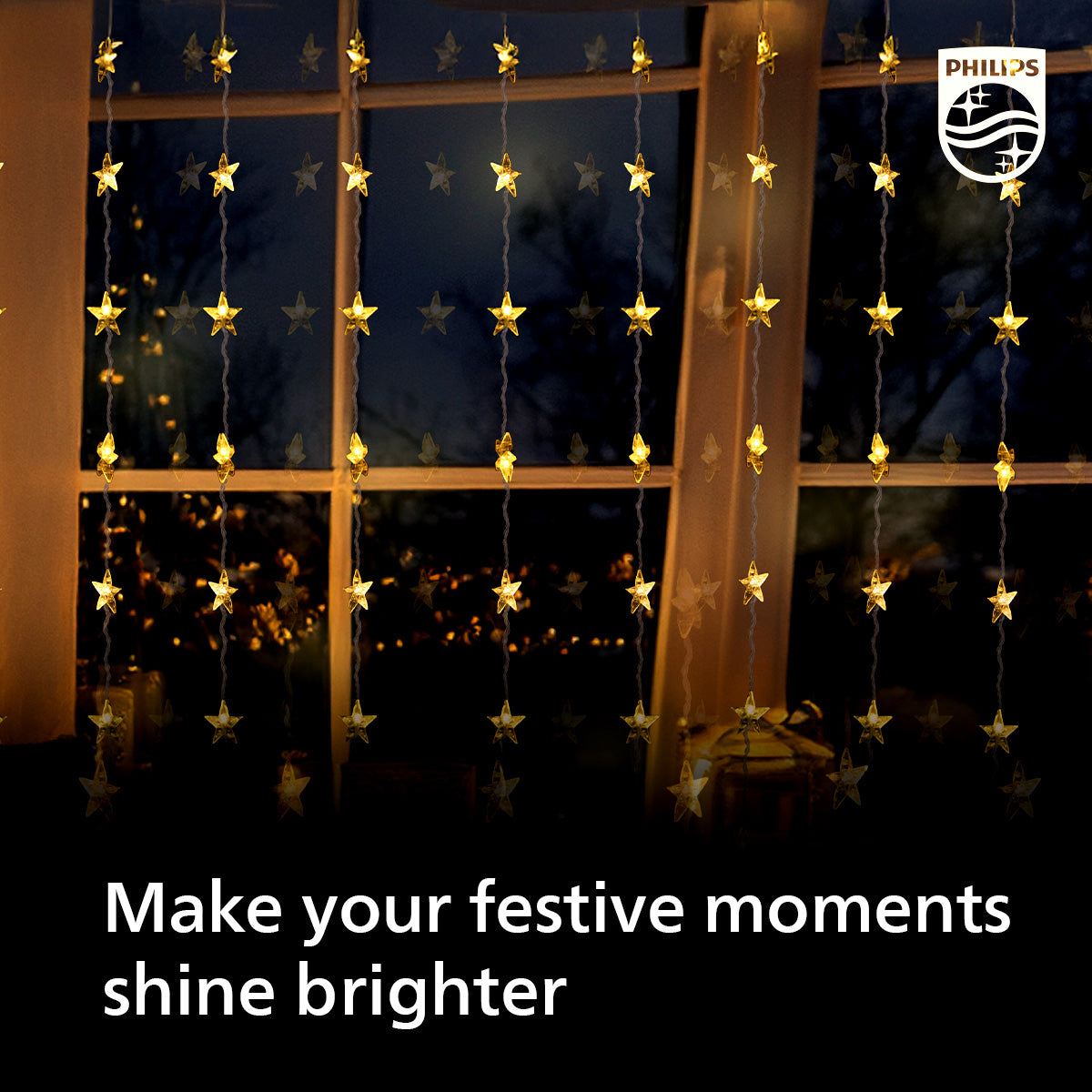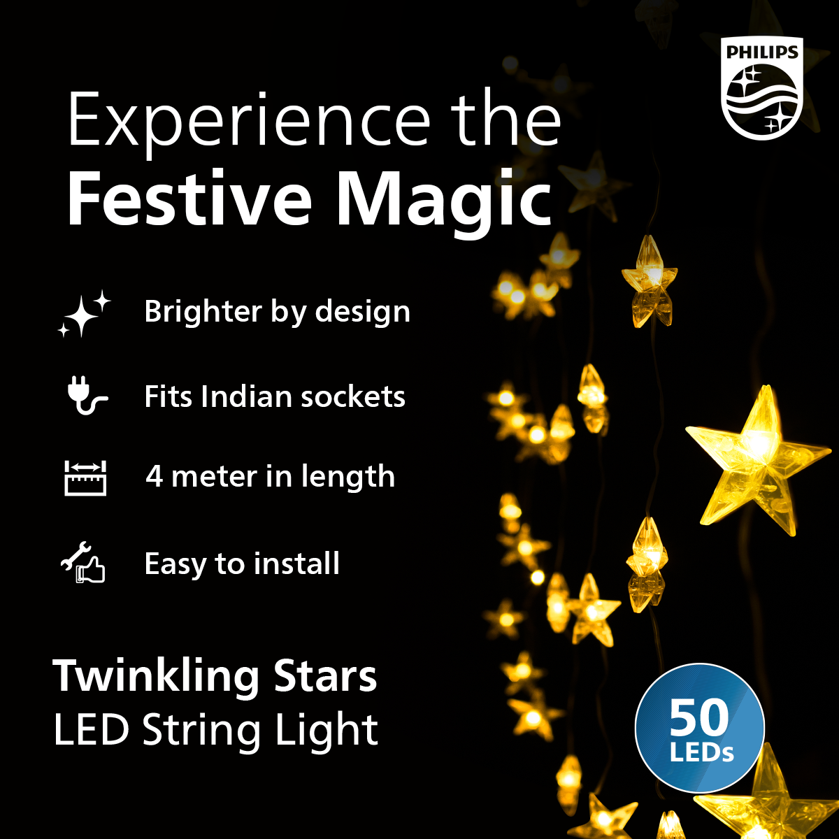 Bring a magical sparkle to your celebrations with the Philips Twinkling Stars String Light. With 50 warm and radiant LEDs across a 4-meter length, this decorative lighting solution is designed to create a starry ambiance that enhances your festive décor. Perfect for balconies, windows, living rooms, or puja corners, these lights add charm and brightness to every occasion.
