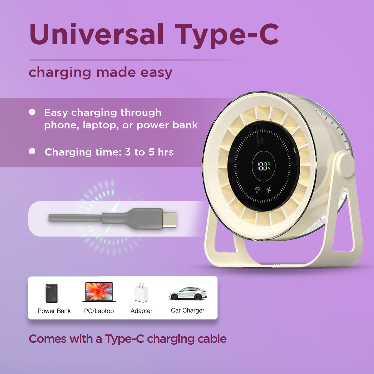 Universal Type-C Charging: Easily recharge via laptop, power bank, or car charger in just 4 to 5 hours.